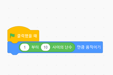 '10만큼 움직이기'의 '10'자리에 '1부터 10사이의 난수'를 넣어보았습니다. 이렇게 하면 클릭했을 때 10만큼 움직이는 것이 아니라 1~10만큼 랜덤으로 움직입니다. '회전하기' 코드로 난수만큼 회전할 수도 있고, '~좌표를 ~로 정하기' 코드로 무작위 위치로 이동하게 만들 수도 있습니다.