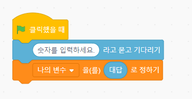 '변수'탭을 확인해봅시다. 우선 간단하게, 숫자를 묻고 대답을 변수에 저장하는 코드를 보여드리겠습니다.