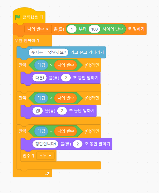 한 번 업다운 게임을 만들어볼까요? 지난 시간에 배운 난수를 활용해서, 1부터 100까지의 숫자 중 하나를 정하고, 만약 입력한 숫자가 정한 숫자보다 크다면 다운, 작다면 업, 같다면 게임이 끝나는 코드를 만들어보세요! 정답은 아래 더보기에 있습니다.